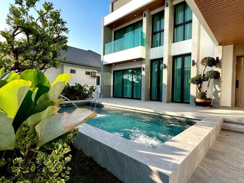 Set within a limited collection of just five private homes, this large detached pool villa at Impress Village offers space, privacy, and modern comfort in one of East Pattaya’s most desirable residential zones near Siam Country Club. Designed for family living, the property combines generous indoor space with a private swimming pool and secure community setting.