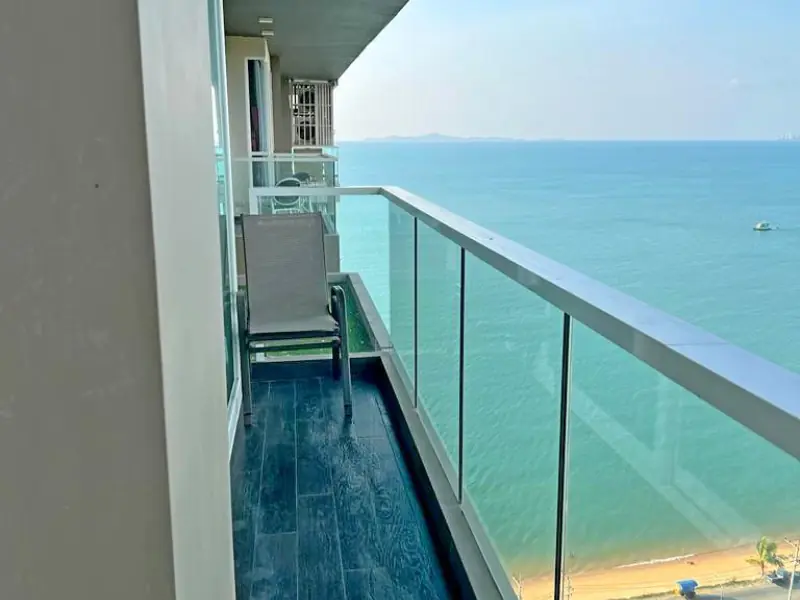 TRUE BEACHFRONT PROPERTY – holds good value over time. Un-Blocked views Highest floor no neighbors looking down into your living room bedroom. Un-block 180-degree views. No unit in front to spoil your view. Direct sea view, Mountain view, Pattaya city view. Able to watch fireworks at Siam Legend and probably even up to Pattaya City.  ! Unique Type E layout. Generous USABLE sized outdoor balcony to comfortably sit 6 to 8 guests for afternoon tea. No afternoon sun! Breezy! Never rented out. Condition as day one. Security