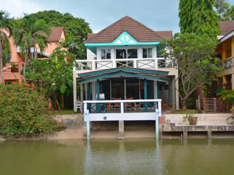 Riverfront house with 3 bedrooms, 4 bathrooms, furnished, with electrical appliances, a relaxation corner, and a dining area on the front balcony. The house also includes access to a shared swimming pool, parking, and 24-hour security guards.