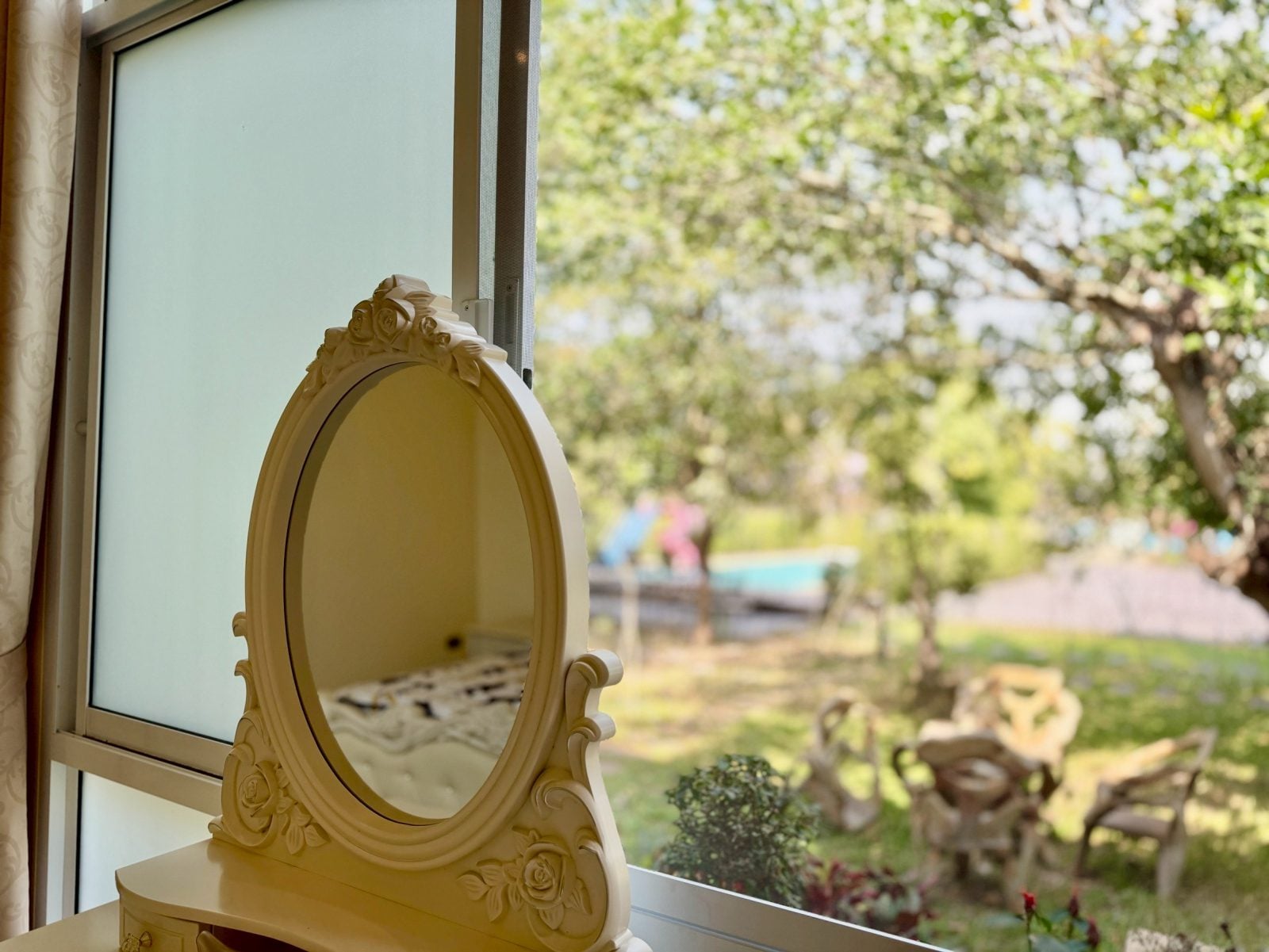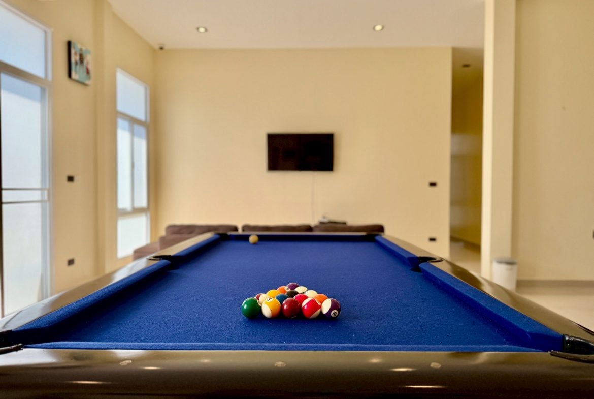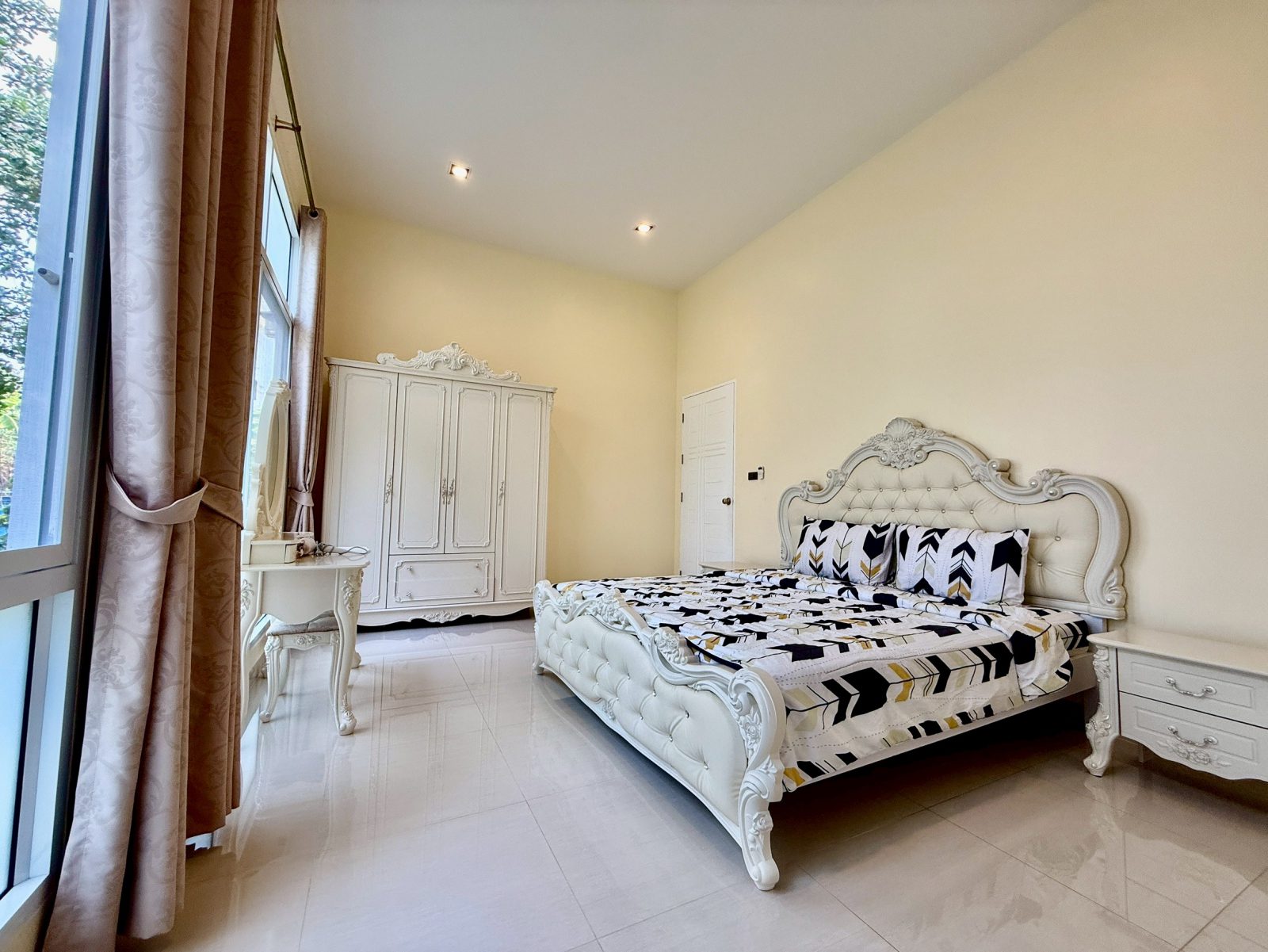 The resort residence is thoughtfully laid out with four spacious bedrooms, each with its own ensuite bathroom, creating comfort and privacy for family members or guests. Generous interior proportions allow for relaxed living, while large openings connect the indoor spaces to the surrounding garden and pool area.