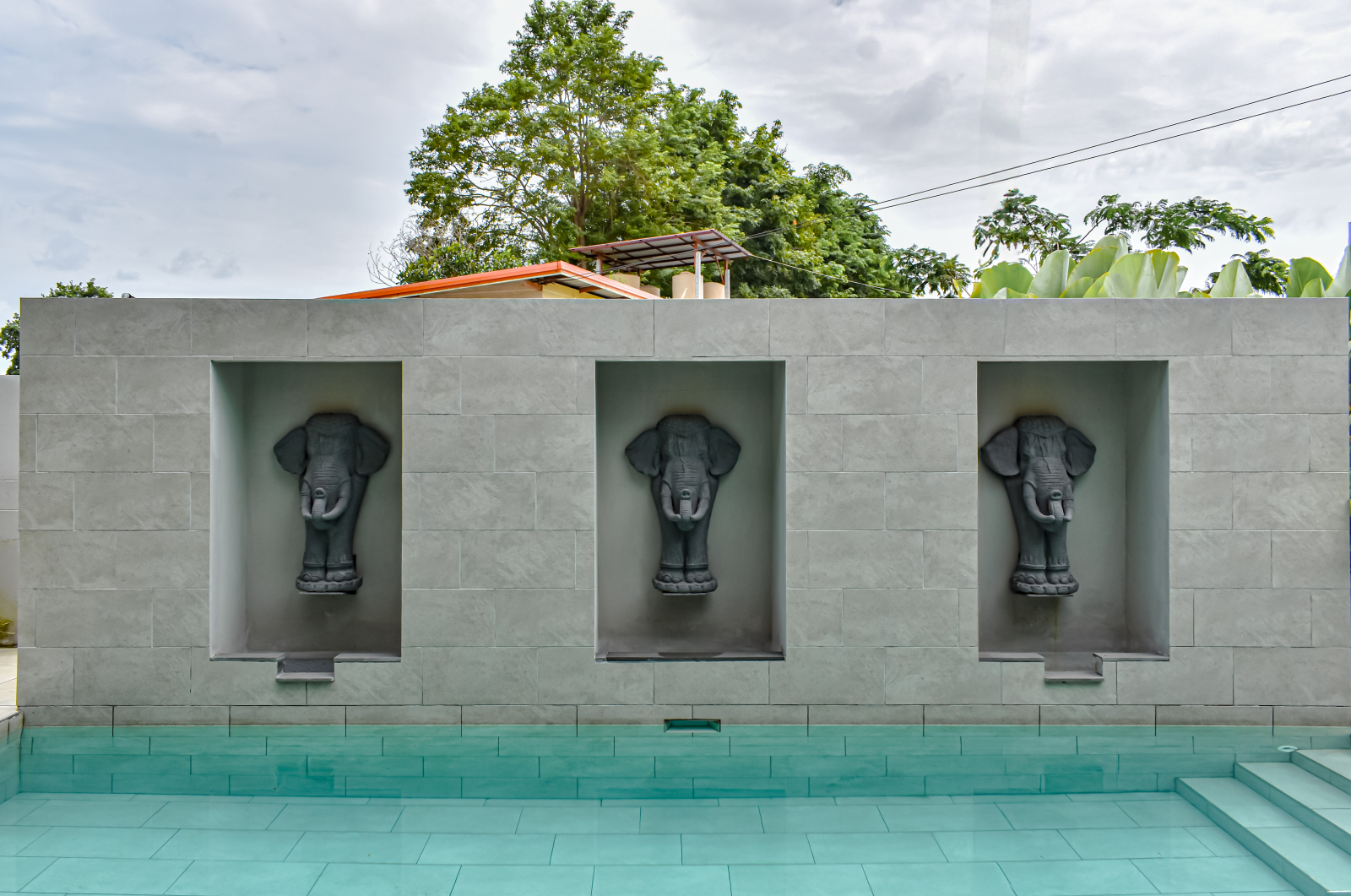 Step outside to a lush tropical escape — shaded patio, overhanging rooflines, and a resort-style private pool nestled in nature.