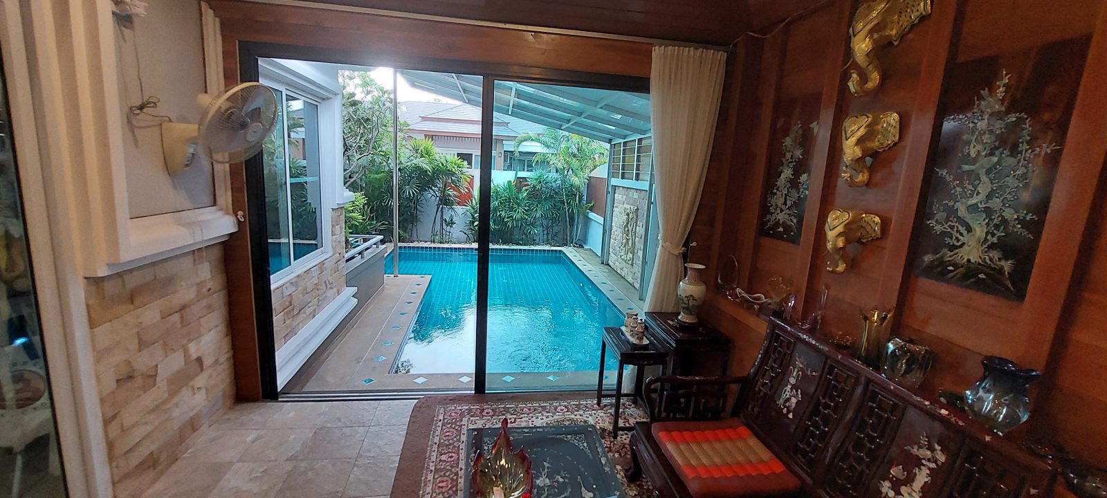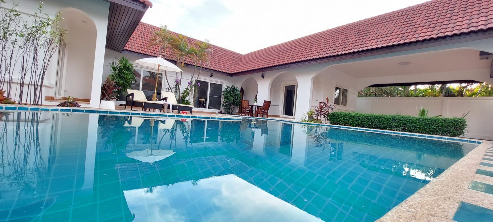 Baan Mae 1 Pool Villa, is a large land size of 544 Sq.m., Usage space 203 Sq.m., with 3 bedrooms, 3 bathrooms (all ensuite), and a walk-in closet in all bedrooms, Saltwater system swimming pool, pool size 8.3x4.2 meters with waterfall, Outside Counter Bar with Big screen TV remote control curtains, Included all furniture and Electrical...
