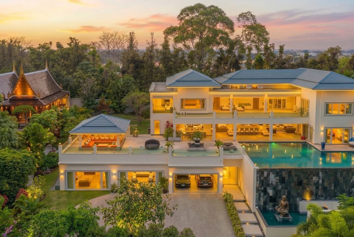 An exceptional luxury residence positioned on the top row of Siam Royal View, one of Pattaya’s most prestigious gated hillside estates. This expansive three-storey villa offers uninterrupted panoramic sea and city views, combining architectural scale, privacy, and refined living within a secure residential enclave.