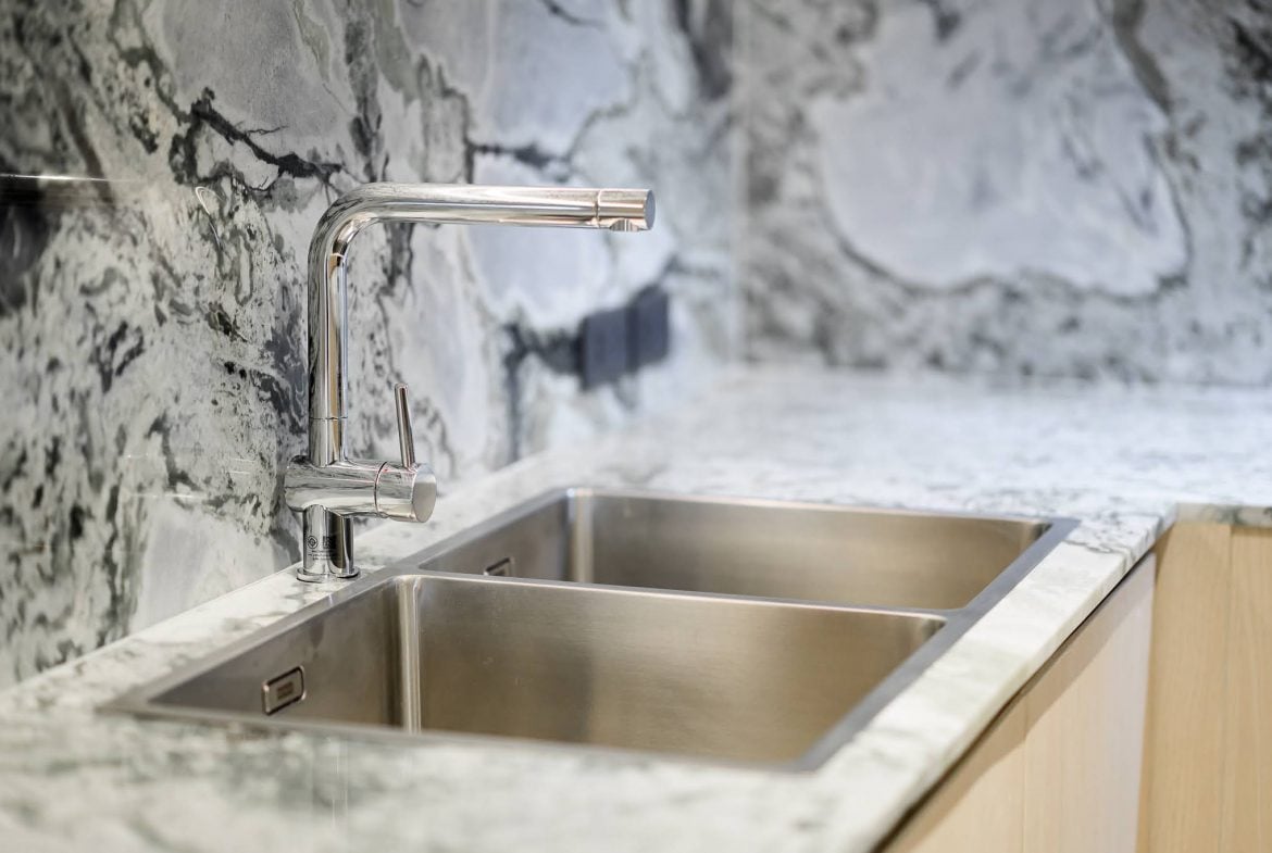 Open-plan kitchen connected to dining and living area