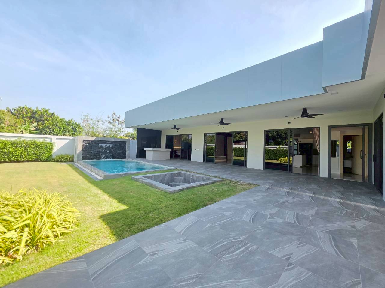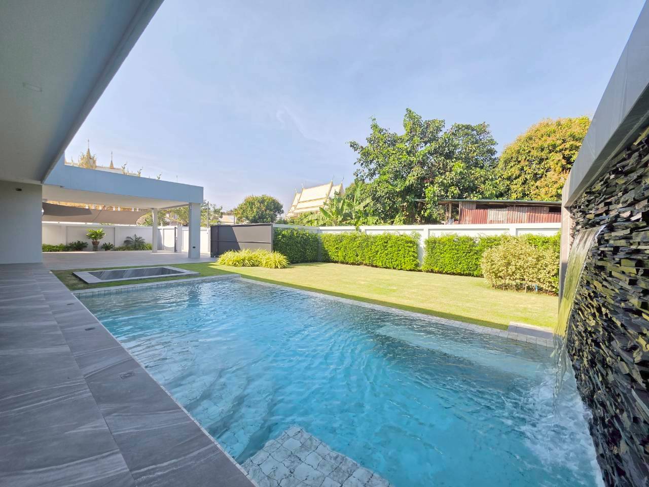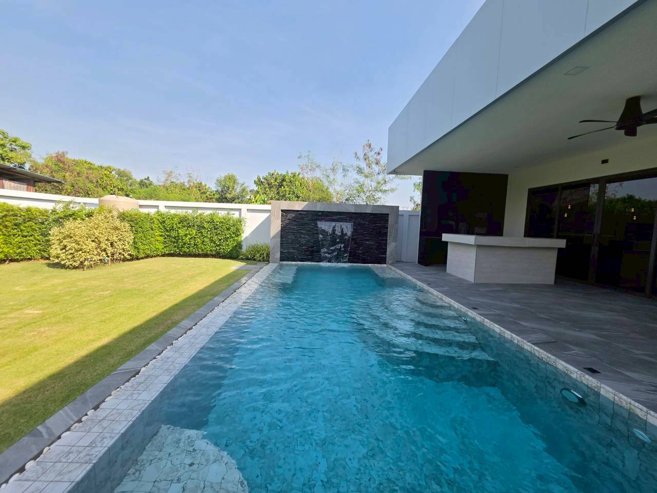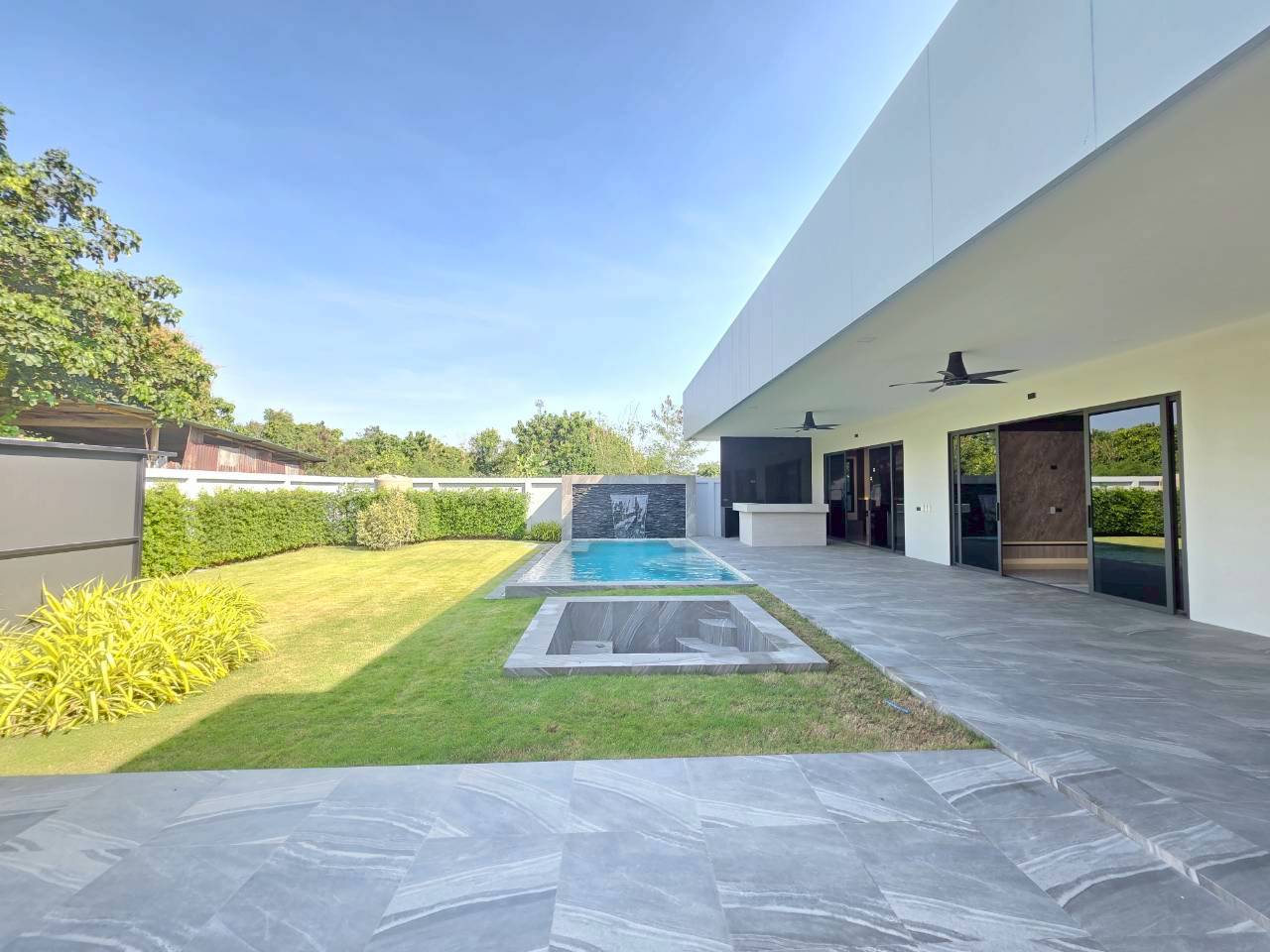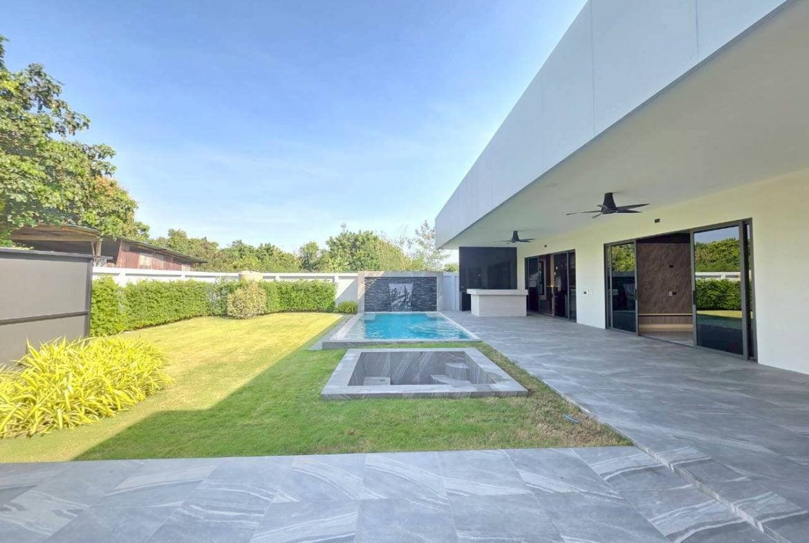 Designed for privacy, space, and long-term comfort, this modern pool villa offers a refined indoor-outdoor lifestyle on a generous land plot in the Toongklom-Talman area of East Pattaya. The home is thoughtfully planned for both everyday living and entertaining, featuring a saltwater overflow pool, dedicated outdoor bar and BBQ zone, and secure private access. Practical additions such as a laundry room, storage areas, and wine cellar enhance usability for owner-occupiers and lifestyle-focused buyers.