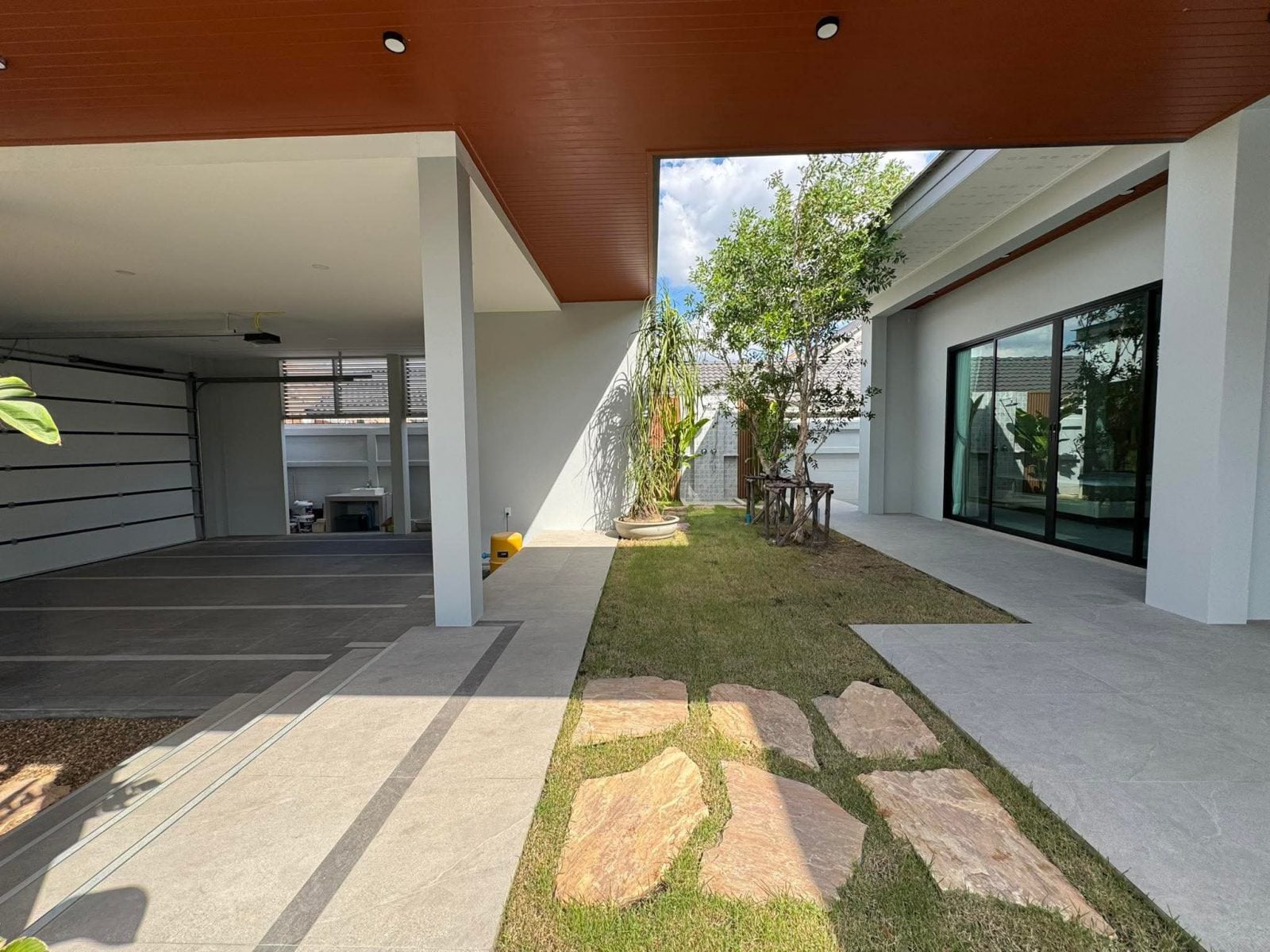 - Covered garage with remote-controlled shutter door for two cars