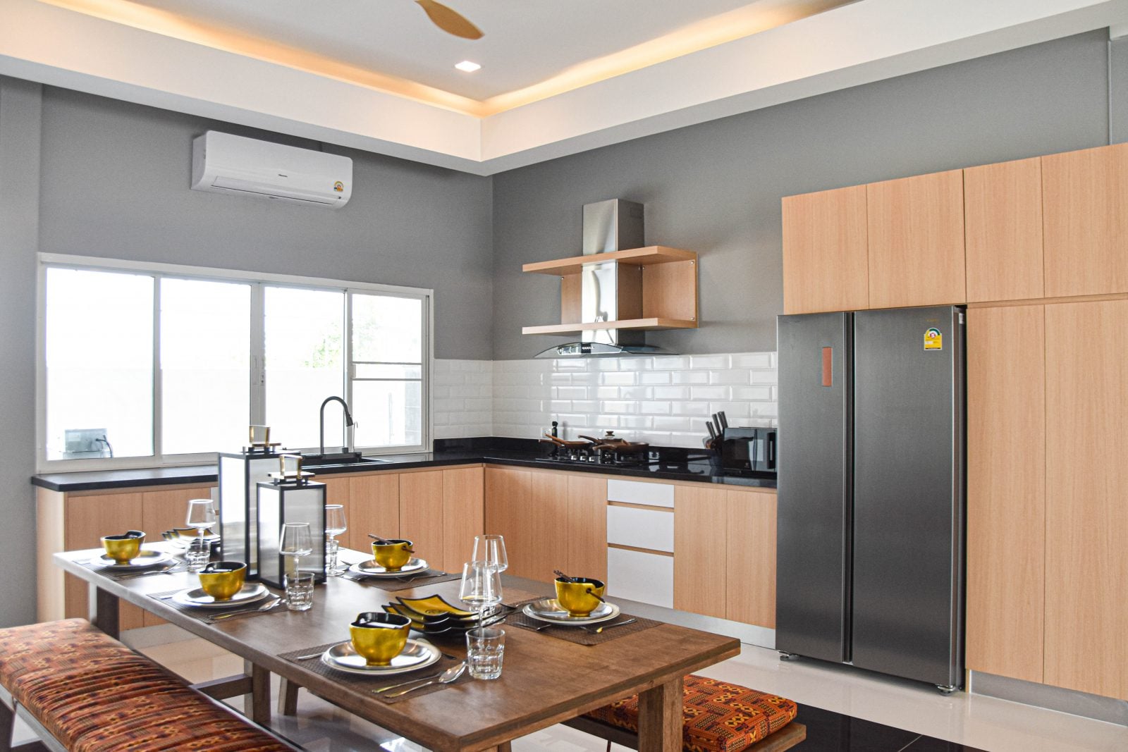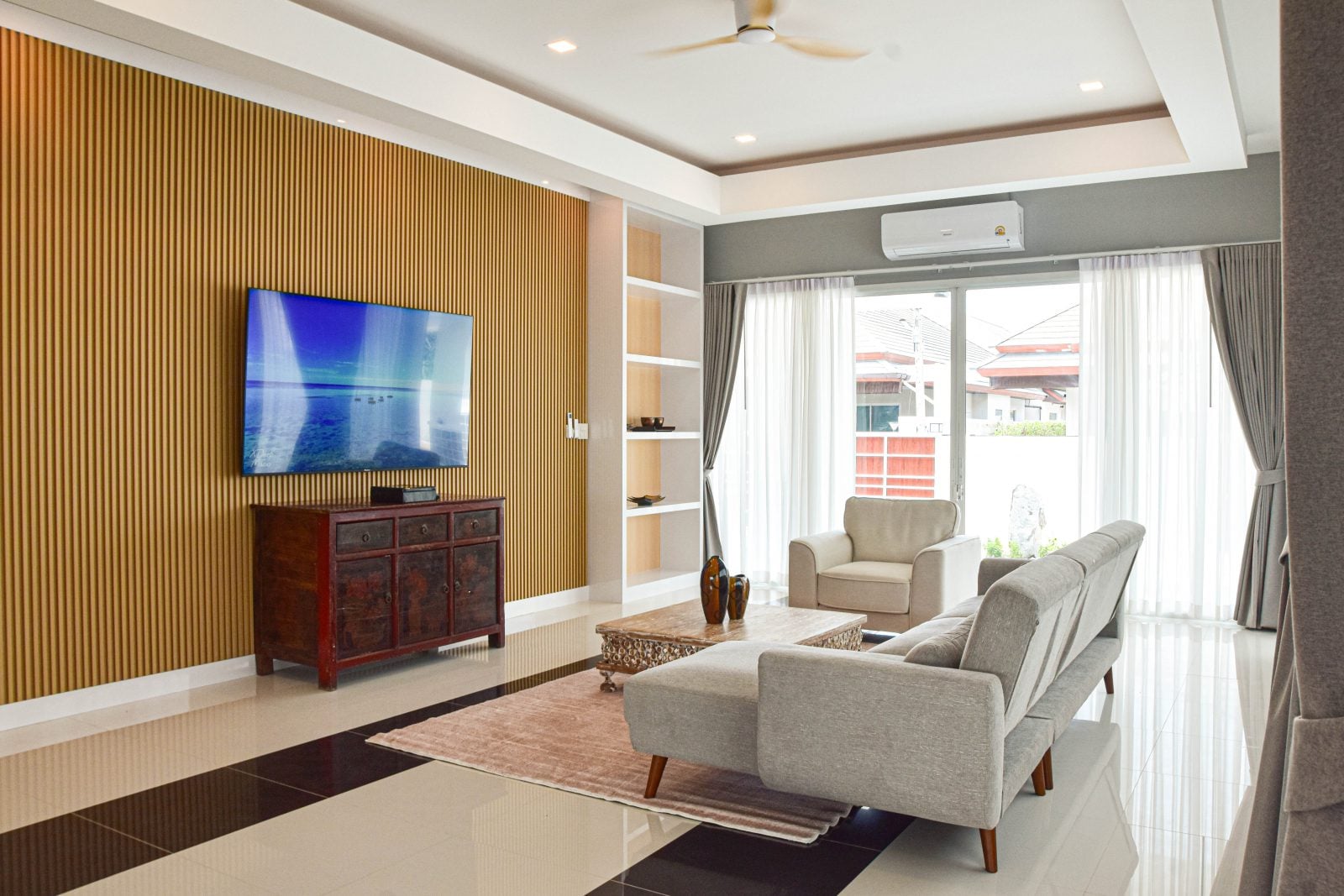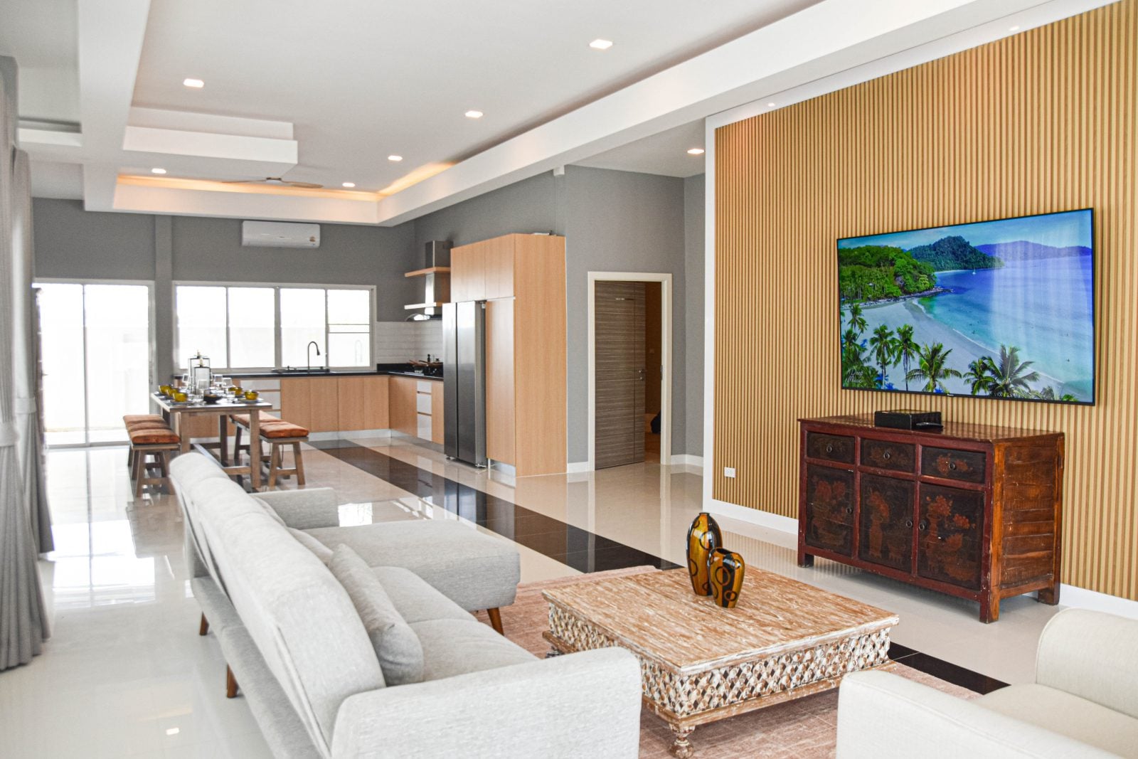 The home’s centerpiece is a brand-new European kitchen with appliances, complemented by a fully equipped outdoor kitchen — complete with gas stove, fryer, fridge, and washer — perfect for entertaining or family gatherings. The living room offers a true cinematic experience with its oversized 65″ smart TV and stylish ceiling fans throughout.