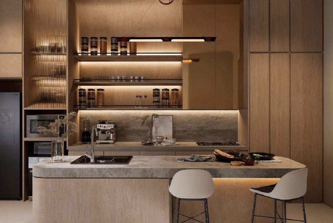 Modern kitchen with open living and dining space